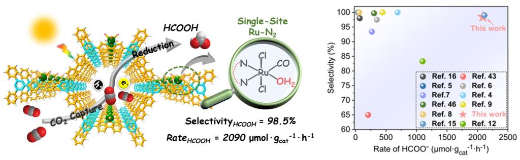 图8.团队提出一种原位共价键合策略,将H2O取代的Ru-N2锚定到共价三嗪框架材料中实现高选择性光还原CO2到甲酸