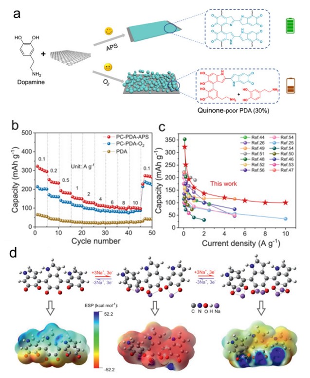 图4. 团队提出在多孔碳表面形成超薄富醌官能团的聚多巴胺涂层作为钠离子电池正极材料