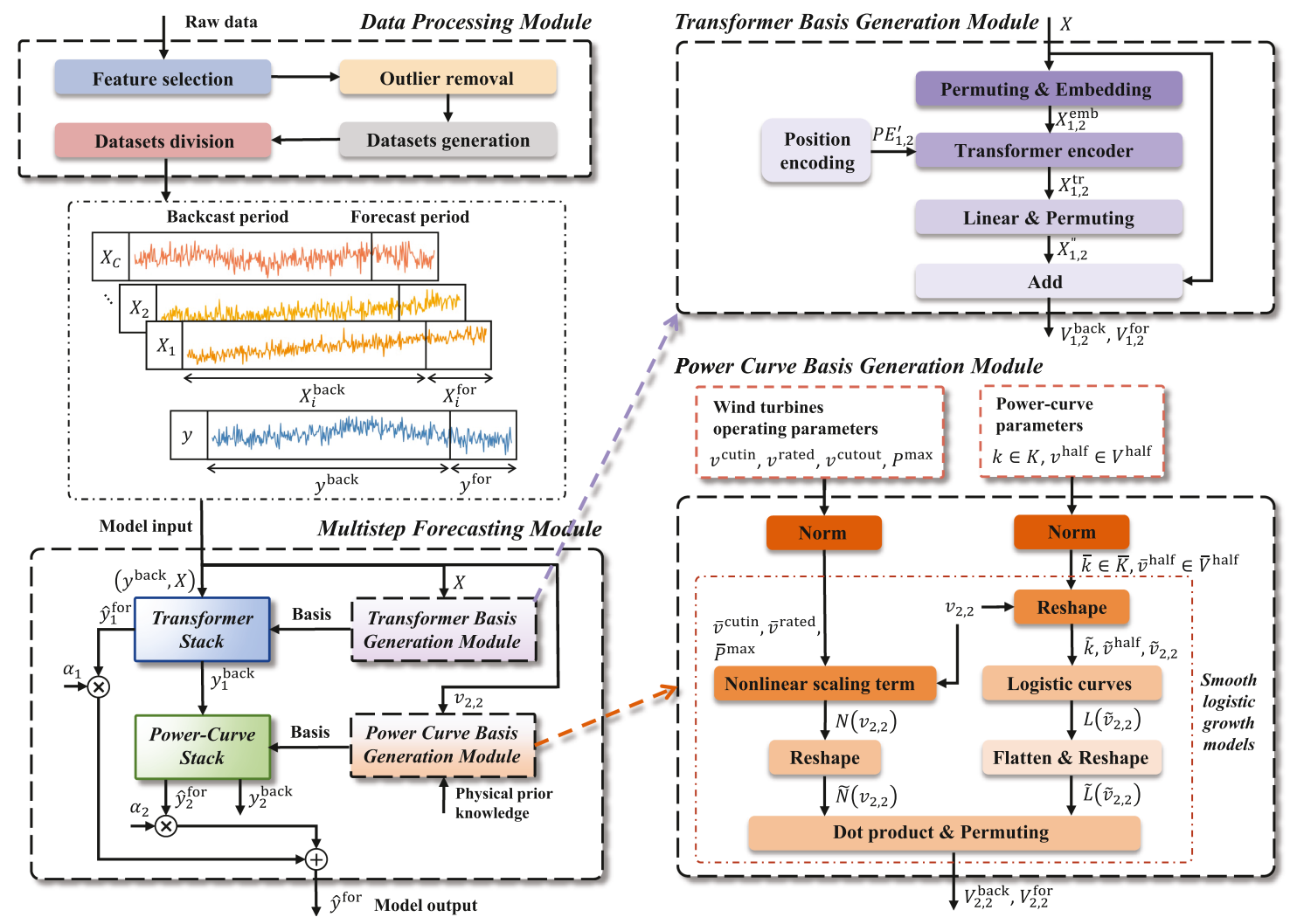 短期风电功率预测是保障电网稳定运行、优化能源调度的关键技术,但其面临多重挑战:风速的强波动性与间歇性、风电功率曲线的高度非线性、SCADA 数据存在的噪声与缺失问题,以及传统模型难以平衡预测准确性与物理可解释性的矛盾。现有深度学习模型多为 “黑箱” 结构,缺乏对风机运行物理约束的考量,而 NBEATSx 等模型的静态权重聚合策略也难以适配复杂的风电时序特征。为解决上述问题,团队提出物理信息感知的自适应权重 NBEATSx(PIAW-NBEATSx)预测框架,创新性地将风机切入风速、额定风速、切出风速、额定功率等运行约束通过平滑逻辑增长模型嵌入基函数设计,构建功率曲线堆栈;同时引入 Transformer 栈捕捉复杂时序依赖关系,并采用动态可训练权重机制替代传统固定求和策略,实现双栈输出的自适应融合。该方法既保证了预测结果的物理一致性,又提升了模型对复杂工况的适配能力,经 2MW 风机实测数据验证,预测精度与鲁棒性显著优于 Bi-LSTM、TCN、传统 NBEATSx 等基准模型。