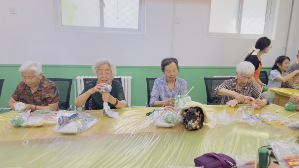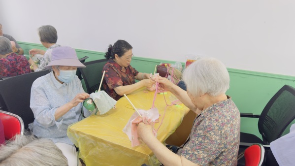 活动中,指导老师首先介绍“艾草养生锤”的功效与使用益处,用它轻轻敲打身体各个部位,可以疏通经络,加快人体血液循环。接着,老同志们在指导下打开材料包,依次铺好粗布,放上艾草包和锤柄,需要将艾草包用力捏成紧实的球形,用粗布包好艾草包,形成团球,在团球根部用麻绳打结扎紧后,麻绳缠绕着锤柄和粗布一圈圈扎紧,最后打结收尾。看似简单的步骤做起来却大有门道,要想成品美观且敲起来有力道,就要将艾草球团捏紧实,粗布包裹和麻绳缠绕也需要一定的力量且排序整齐。大约30人参加本次活动,制作过程中,大家相互交流,相互帮助,欢声笑语中,一个个花色不一的艾草锤就呈现在眼前,五彩缤纷,药香四溢,老同志们脸上洋溢着藏不住的喜悦。