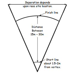 车辆将从指定的起始线向指定的终点线行驶,出发时车辆前身仅能刚好触碰到起始线。测量的距离将以车辆前身边缘为准。比赛中,车辆行驶的路线应该在一个扇形的区域内,顶点附近的一条弧线是起始线,终点线则以指定距离为半径的另一圆弧标识。比赛场地将会标明确切的比赛区域及路线布局。图为一个路线布局的示例。场地会在终点线之外标明一个过界区域,如果车辆行驶到此过界区域,那么此次的行驶将被认为是不合格的。