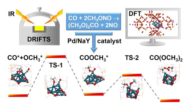 Ø 题目:间接氧化羰基化合成碳酸二甲酯的催化反应机理研究:直接捕获反应中间物种 Elucidation of the reaction mechanism of indirect oxidative carbonylation of methanol to dimethyl carbonate on Pd/NaY catalyst: Direct identification of reaction intermediates 煤制碳酸二甲酯(Dimethyl carbonate,DMC)作为现代煤化工五大示范工程中煤制乙二醇路线的拓展,可通过改变催化剂体系实现合成草酸二甲酯到碳酸二甲酯的转变,是煤炭高效清洁转化和低碳化利用的新兴路线,受到了工业界和学术界的广泛关注。该工作设计了一系列原位漫反射红外(DRIFTS)实验,包括稳态、动态、瞬态的DRIFTS,捕获了反应中间物种,并结合DFT理论计算,证实了COOCH3*物种的形成是该反应的速度控制步骤,相关工作发表在: