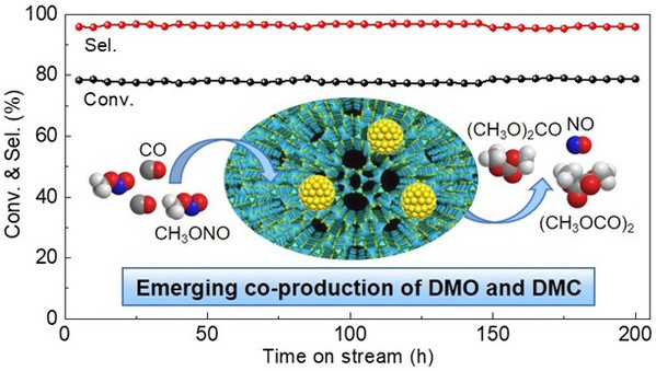 J. Catal. 412 (2022) 30-41(SCI一区,IF=7.9) https://www.sciencedirect.com/science/article/abs/pii/S002195172200224X?via%3Dihub Ø 题目: Pd基分子筛催化剂的制备及羰基合成碳酸二甲酯 Highly active Pd containing EMT zeolite catalyst for indirect oxidative carbonylation of methanol to dimethyl carbonate 煤制碳酸二甲酯(Dimethyl carbonate,DMC)作为现代煤化工五大示范工程中煤制乙二醇路线的拓展,可通过改变催化剂体系实现合成草酸二甲酯到碳酸二甲酯的转变,是煤炭高效清洁转化和低碳化利用的新兴路线,受到了工业界和学术界的广泛关注。目前制约煤制碳酸二甲酯的主要技术瓶颈是CO和亚硝酸甲酯(CH3ONO)羰基合成DMC催化剂中价态Pd活性位在还原反应气氛中稳定性较差。 碳酸二甲酯(Dimethyl carbonate,DMC)是一种重要的环保型化工原料,能够用来生产聚碳酸酯、异氰酸酯、烯丙基二甘醇碳酸酯、医药、除垢剂、农药等,用途十分广泛。制备了EMT分子筛负载Pd催化剂,发现Pd/EMT催化剂对合成碳酸二甲酯具有优异的稳定性,这主要得益于Pd团簇与EMT分子筛骨架较强的相互作用,抑制了Pd团簇的烧结,从而稳定了Pd2+活性位。相关结果已发表在: J. Energy Chem. 52 (2021) 191-201(SCI一区,IF=9.7) https://www.sciencedirect.com/science/article/pii/S2095495620302849?via%3Dihub