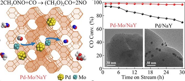Ø 题目:Mo改性Pd/NaY催化剂用于甲醇间接氧化羰基化合成碳酸二甲酯 Mo-promoted Pd/NaY catalyst for indirect oxidative carbonylation of methanol to dimethyl carbonate 碳酸二甲酯(DMC)具有优异的溶解性、生物降解性和低毒性,被认为是一种绿色化学品。甲醇间接氧化羰基化合成DMC具有无爆炸风险、反应条件温和以及原子效率高的优点,应用前景广阔。然而无氯Pd/NaY催化剂中的活性二价Pd物种很容易被CO反应物还原成零价Pd物种,导致Pd烧结和催化剂失活。本文采用了一种自上而下的方法制备了Mo改性Pd/NaY催化剂(Pd-Mo/NaY),在保持贵金属Pd氧化态的同时强化了反应物CO的吸附,实现了催化剂稳定性的提高。通过Mo改性,实现了活性二价Pd物种的高度稳定,为甲醇间接氧化羰基化制DMC催化剂的研发提供了新的思路。 Chin. J. Catal. 60 (2024) 344. (SCI一区,IF=16.5) https://doi.org/10.1016/S1872-2067(24)60019-7
