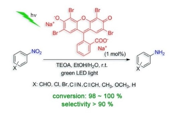 首次将层状双金属氢氧化物作为光敏剂应用到有机合成中,发展了一种高效、高选择性光催化需氧氧化芳香胺合成亚胺化合物的绿色合成方法。反应以空气中的氧气为氧化剂,避免了有毒、腐蚀性强氧化剂的使用,是一种绿色的选择性氧化方法。该工作对进一步认识层状双金属氢氧化物可以作为一种高效的光催化材料具有重要的意义,也为绿色制备亚胺类化合物提供了一条新的合成途径。相关研究结果发表在Chem. Commun.(SCI一区),并且被SYNFACTS杂志在合成化学栏目highlight报道。 4. 有机染料可见光催化硝基芳烃高效、高选择性还原反应研究