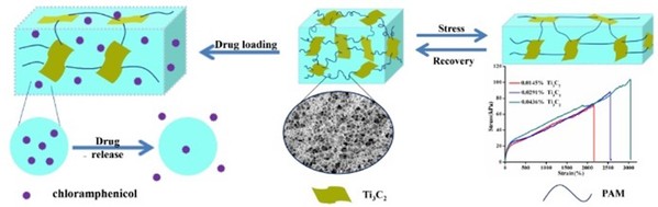 利用可见光、廉价的曙红染料作光敏剂、非贵金属镍的配合物作为催化剂、水相中、没有氧化剂存在的条件下实现了芳香醇化合物高选择性氧化生成醛酮类化合物并且放出氢气的反应,反应条件温和,避免了腐蚀性强氧化剂的使用,并且反应具有很高的原子经济性,以“绿色化学”的理念为基础,为有机合成提供了新思路和新方法。相关结果已发表在Green Chem. 2. 新型Ti3C2/PAM纳米复合水凝胶的制备
