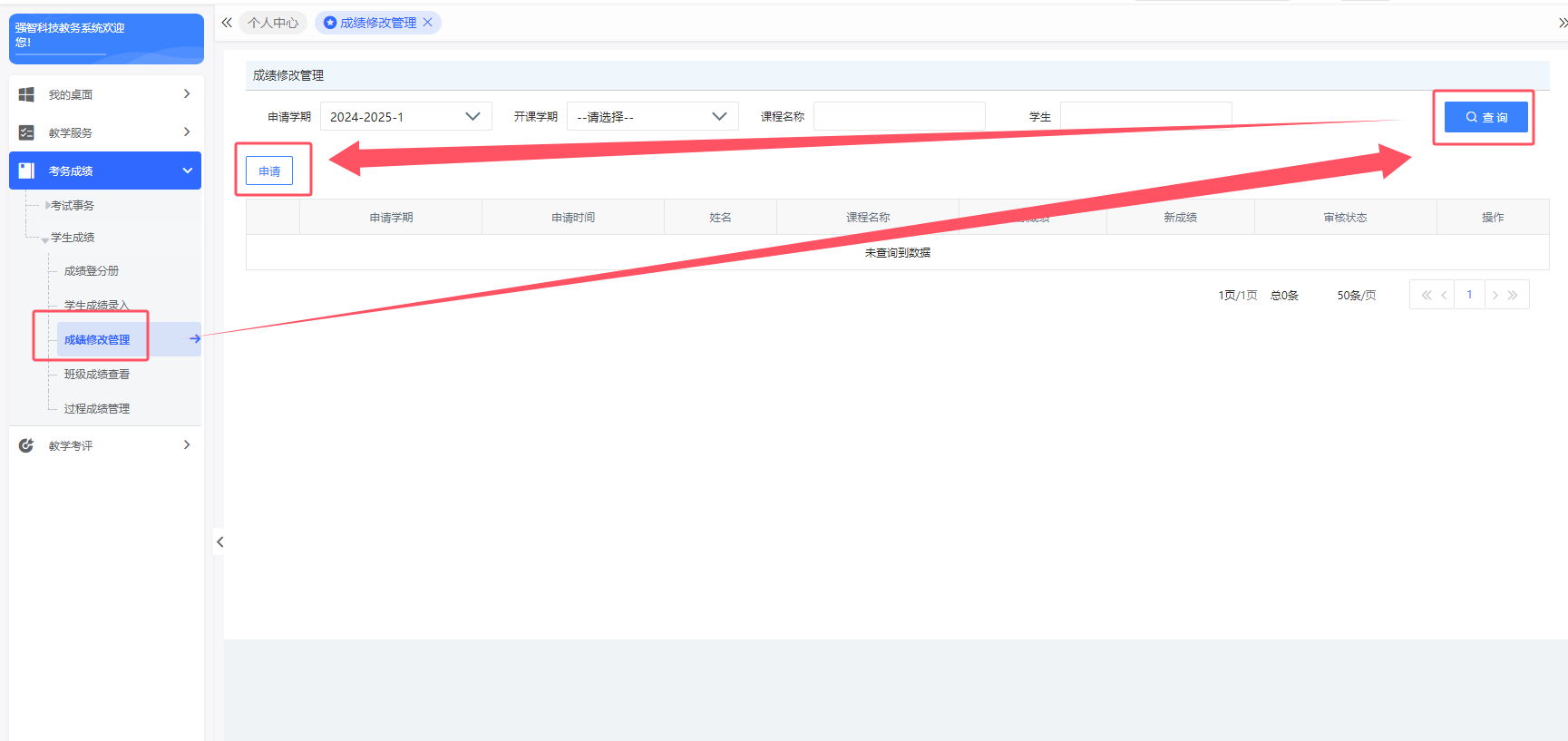 1)进入该模块后不需要选择学期,点击右边[查询],待按钮出现后点击[申请]。