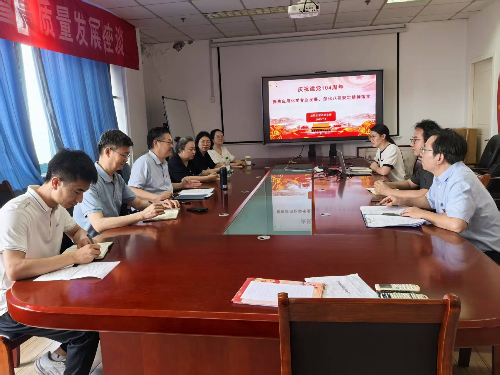 为进一步推动应用化学专业高质量发展,切实落实中央八项规定精神,7月1日,应用化学系党支部召开了“聚焦应用化学专业发展 深化八项规定精神落实”交流研讨会。会议由党支部书记杨修洁主持,学院党委书记张永宁出席,支部教师党员参加。