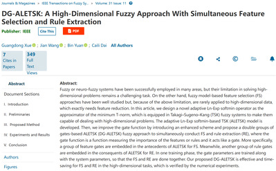 论文“DG-ALETSK: A High-Dimensional Fuzzy Approach With Simultaneous Feature Selection and Rule Extraction”(DG-ALETSK: 同时进行特征选择与规则提取的高维模糊方法)发表在《IEEE Transactions on Fuzzy Systems》,论文第一作者为2019级博士生薛广东,通讯作者为王健教授、袁彬教授。作者提出一种规则前件嵌入特征门同时规则后件嵌入规则门的综合性嵌入策略,借助Ln-Exp软取小算子将原自适应软取小算子进一步改进为自适应Ln-Exp软取小算子,改进后的算子比原算子能更好地逼近取小T范数,并在此基础上提出自适应Ln-Exp TSK(ALETSK)模糊系统,真正实现了在一次训练过程中同时完成特征选择与规则提取任务,该工作进一步扩展了模糊系统在高维场景中的应用,并为特征选择与规则提取的研究提供新的角度。