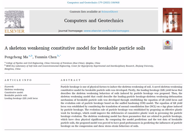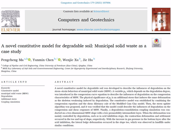近日,我院教师马鹏程在骨架可降解土本构模型及多场耦合理论研究方面取得新进展,相关研究成果《A novel constitutive model for degradable soil: Municipal solid waste as a case study》和《A skeleton weakening constitutive model for breakable particle soils》发表在《Computers and Geotechnics》。《Computers and Geotechnics》是岩土工程领域国际顶级期刊(SCI一区Top,影响因子6.2)。论文第一作者为马鹏程老师,通讯作者为浙江大学陈云敏院士,开云电竞投注(华东)为第一署名单位。该研究得到了国家自然科学基金基础科学中心项目和青年科学基金项目的资助。