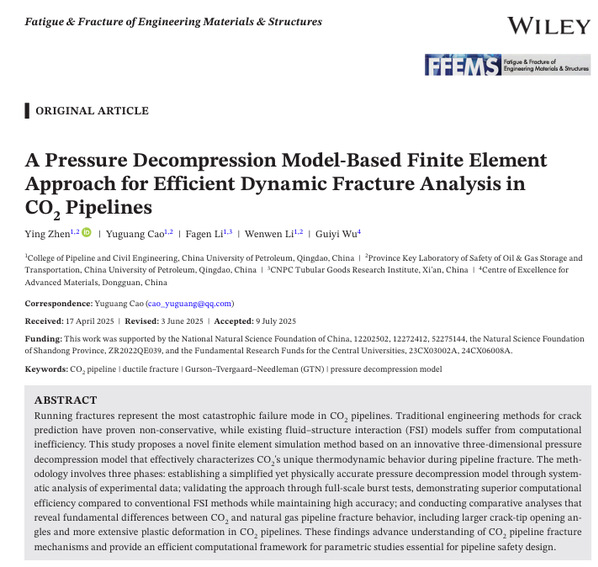 近日,我院甄莹教师团队在超临界二氧化碳止裂控制研究方向取得新进展,相关研究成果《A pressure decompression model-based finite element approach for efficient dynamic fracture analysis in CO₂ pipelines》发表在《Fatigue & Fracture of Engineering Materials & Structures》。论文第一作者为甄莹老师,通讯作者为曹宇光教授,开云电竞投注(华东)为第一署名单位和唯一通讯单位。该研究得到国家自然科学基金面上项目及山东省自然科学基金项目、中央高校基本科研业务费项目的联合资助。