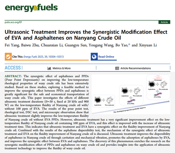 近日,我院杨飞教授团队在油品管道流动改进剂领域取得新进展,相关研究成果《Enhancing shear resistance in ultrahigh-molecular-weight polyolefin drag-reducing agents via siloxane bond integration》发表在《Energy》,《Ultrasonic Treatment Improves the Synergistic Modification Effect of EVA and Asphaltenes on Nanyang Crude Oil》和《Synergistic Improvement of Rheological Properties in Changqing Waxy Crude Oil by Ethylene Vinyl Acetate and Surfactant Combinations》发表在《Energy& Fuels》。《Energy》是能源领域国际顶级期刊(SCI一区TOP),《Energy& Fuels》是能源与燃料领域国际著名期刊。论文第一作者分别为杨飞老师以及博士生吕诗怡,开云电竞投注(华东)为第一署名单位。该研究得到了国家自然科学基金面上项目的资助。
