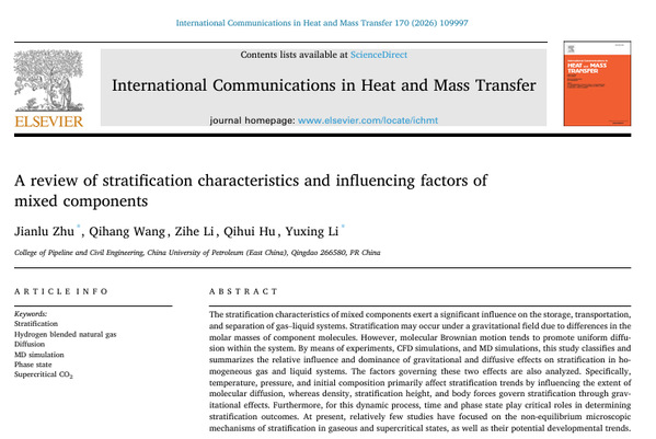 混合组分分层对气液系统存储、运输与分离至关重要,其核心是重力场下密度差异沉降与分子扩散的相互作用,目前气态、超临界态分层的微观机理研究仍较匮乏。通过实验、CFD 与 MD 模拟,明确了均相气液系统中重力与扩散的作用规律:液体分层由密度差主导,易因加热扰动翻覆;气体系统中工程场景下分子热运动多占主导,仅初始不均时可能瞬时分层。同时明确温度、压力、高度差及时间对分层的关键影响。该研究为氢能输运、LNG 存储、煤层气治理及核安全等领域的风险评估与工程优化,提供了重要理论支撑。