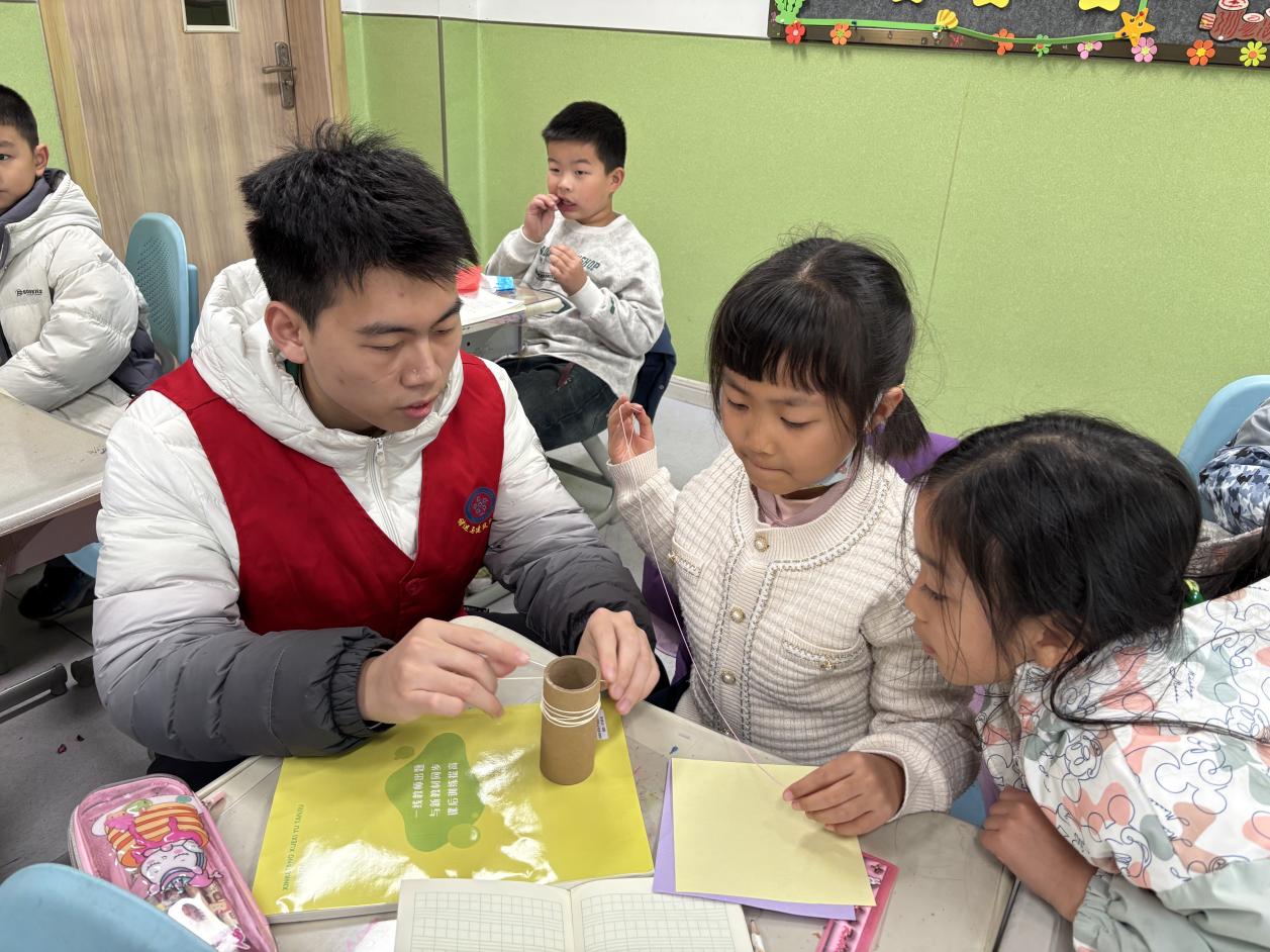 在实践环节,志愿者采用分组指导模式,确保每位学生都能参与其中。活动选用环保纸筒、彩绳、彩纸等安全材料,模拟传统钟楼的制作过程,既保留了手工建构的核心技能,又适合小学生操作。卞存蕾耐心示范操作步骤,从纸筒的缠绕技巧到钟面的绘制方法逐一细致讲解。学生们在指导下逐步完成彩绳缠绕、钟面粘贴、塔顶装饰等环节,创造出色彩鲜艳、造型各异的“迷你钟楼”作品。这一形式既保障了操作安全,也激发了学生的创造力与空间建构能力。
