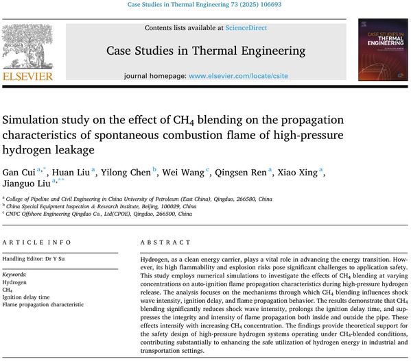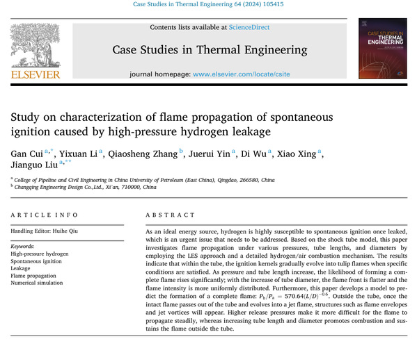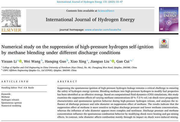 近期,我院崔淦教授团队在高压氢气泄漏自燃机理与火焰传播特性研究方面取得多项重要成果。相关研究成果《Study on the characteristics and predictive model of autoignition induced by shock wave from high-pressure hydrogen leakage》、《Numerical study on the suppression of high-pressure hydrogen self-ignition by methane blending under different discharge conditions》发表在《International Journal of Hydrogen Energy》;《Study on characterization of flame propagation of spontaneous ignition caused by high-pressure hydrogen leakage》、《Simulation study on the effect of CH4 blending on the propagation characteristics of spontaneous combustion flame of high-pressure hydrogen leakage》发表在《Case Studies in Thermal Engineering》。其中,《International Journal of Hydrogen Energy》是氢能研究领域的国际著名期刊(SCI二区),《Case Studies in Thermal Engineering》是热工程应用研究领域的国际核心期刊(SCI 二区)。论文通讯作者为崔淦老师,开云电竞投注(华东)为第一署名单位。上述研究得到了国家自然科学基金及山东省自然科学基金等项目资助。