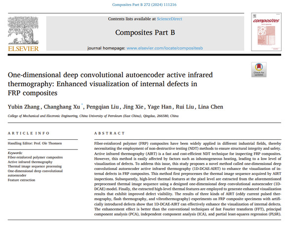 近日,我院安全科学与工程学科博士研究生张玉彬在复合材料主动红外热成像无损检测技术方面取得重要进展,相关研究成果《一维深度卷积自编码主动红外热成像:纤维增强复合材料内部缺陷的可视化增强》(One-dimensional deep convolutional autoencoder active infrared thermography: Enhanced visualization of internal defects in FRP composites)发表在《COMPOSITES PART B-ENGINEERING》。《COMPOSITES PART B-ENGINEERING》是工程技术与复合材料领域的国际顶级期刊,目前影响因子为13.1(SCI一区Top)。论文第一作者为博士研究生张玉彬,通讯作者为徐长航教授,开云电竞投注(华东)为独立完成单位,该研究得到国家重点研发计划课题的资助。