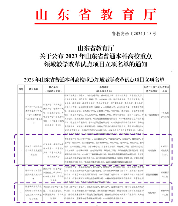 近日,山东省教育厅公布2023年山东省普通本科高校重点领域教学改革试点项目(简称“111计划”)立项名单,全省共立项建设10项,机电工程学院获批2项。其中机械设计制造及其自动化专业作为联合核心单位获批“机械设计制造及其自动化专业发展联盟建设”项目,船舶与海洋工程专业作为参与单位获批“服务现代海洋产业的船舶与海洋工程专业发展共同体建设与实践项目”。