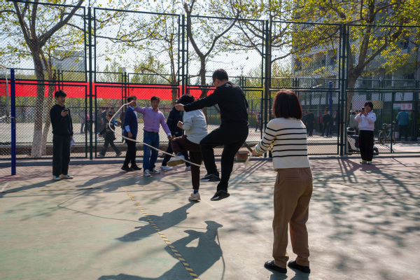 运动会共设置了四个比赛项目,分别是8字跳绳、趣味套环、沙包掷准和十米地滚球。在8字跳绳项目中,选手们身手敏捷,配合默契,一次次成功穿越绳网;在趣味套环项目中,选手们或蹲或站,小心翼翼地将套环投向目标;在沙包掷准项目中,选手们瞄准目标,奋力投掷;在十米地滚球项目中,选手们或抛或滚,将篮球稳稳地推向终点。