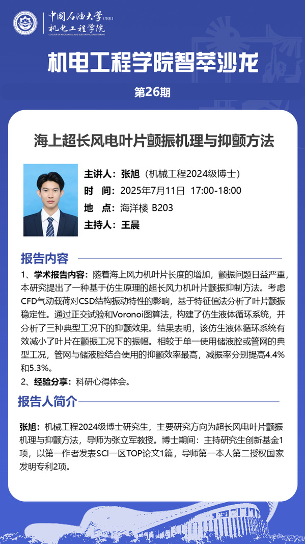 【智萃沙龙(第26期)】海上超长风电叶片颤振机理与抑颤方法(机械工程2024级博士 张旭主讲)