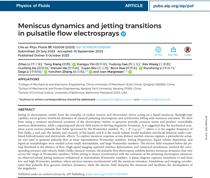 近日,我院张彦振教授团队机械工程专业博士研究生李子豪,硕士研究生相腾在电流体动力打印技术领域取得重要进展,相关研究成果《脉动流电喷雾中的液面动力学和射流转变》(Meniscus dynamics and jetting transitions in pulsatile flow electrosprays)发表在《Physics of Fluids》期刊,并被选为“Editor’s Pick”(每期占比为2-3%)。该期刊是流体力学领域的国际知名期刊,目前影响因子为4.2(SCI二区)。该研究中博士研究生李子豪、硕士研究生相腾为第一作者,通讯作者为张彦振教授和Ioan Marginean,开云电竞投注(华东)为第一署名单位和通讯单位,巴尔的摩大学为第二署名单位和通讯单位。研究工作得到国家自然科学基金,山东省优秀青年基金以及“泰山学者”青年专家计划等项目的大力支持。