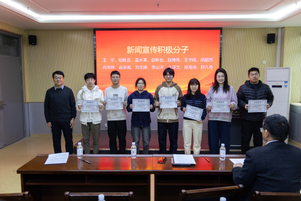 靳国栋宣读表彰决定与聘任通知,王博轩荣获“新闻宣传特别贡献奖”,董建党、纪仁杰、庄晶云、齐瑞、汪小婷、高晨鸣、王麒淼等7人获评“新闻宣传先进个人”,王宁、柏胜昔、盖永革、赵昕怡、赵博伟、王宇硕、胡超然、肖雨婷、赵承凯、刘玉婷、李山河、许译文、骆海涛、舒凡奇等14人获评“新闻宣传积极分子”;齐瑞、李欢、王宁、柏胜昔、崔俊国等5人被学校聘为2025-2026年度特聘记者。随后,殷晓康为获奖师生颁发荣誉证书,并为特聘记者授予聘书。