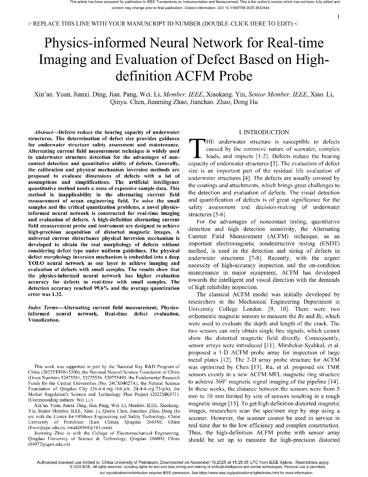 该研究成果以《Physics-informed Neural Network for Real-time Imaging and Evaluation of Defect Based on High-definition ACFM Probe》为题,发表于仪器科学与技术领域权威期刊《IEEE Transactions on Instrumentation and Measurement》(中科院大类2区)。
