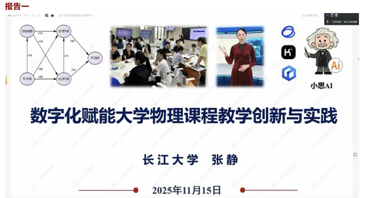 张静教授系统阐述了教育数字化的内涵与国家政策导向,强调需将人工智能技术深度融入教学全过程,探索人机协同、情境交互的新型教学模式。她以自己主讲的课程为例展示了如何利用AI工具引导学生共建资源,并介绍了基于“联通主义”等前沿学习理论和“学习进阶”模型构建的混合式教学模式,并分享了在评价体系上引入AI作为评价主体的改革。