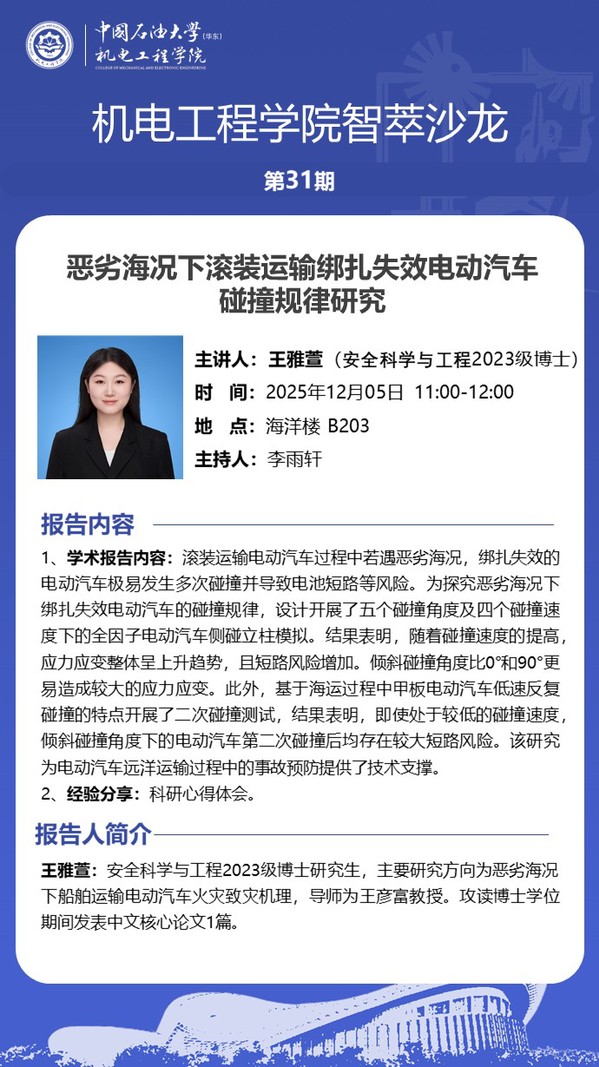 【智萃沙龙(第31期)】恶劣海况下滚装运输绑扎失效电动汽车碰撞规律研究(安全科学与工程 2023级博士 王雅萱)