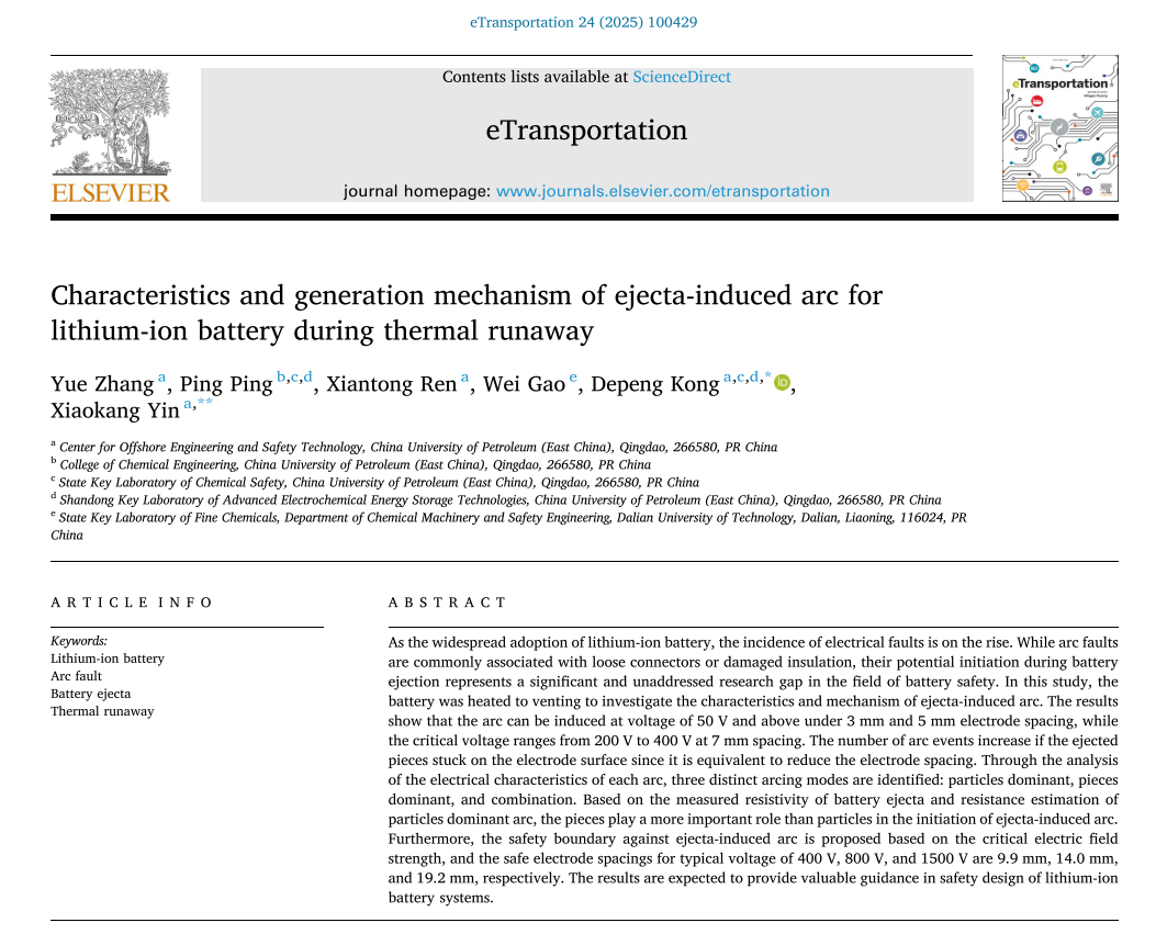 近日,我院安全工程博士研究生张越在锂离子电池热失控颗粒诱发电弧方面取得重要进展,相关成果《锂离子电池热失控过程中喷射物诱发电弧的特性及产生机制》(Characteristics and generation mechanism of ejecta-induced arc for lithium-ion battery during thermal runaway)发表在《eTransportation》。《eTransportation》是由交通电动化领域国际著名专家欧阳明高院士创刊建立,致力为全球学术和产业界服务的国际交通电动化期刊。目前期刊最新SCI影响因子17,中科院学术期刊工程技术领域Q1区的TOP期刊;位列全球交通科学技术领域的SCI学术期刊第1位。论文第一作者为博士研究生张越,通讯作者为孔得朋教授和殷晓康教授,开云电竞投注(华东)为第一署名单位和唯一通讯单位,该研究得到了国家自然科学基金和国家重点研发计划的资助支持。