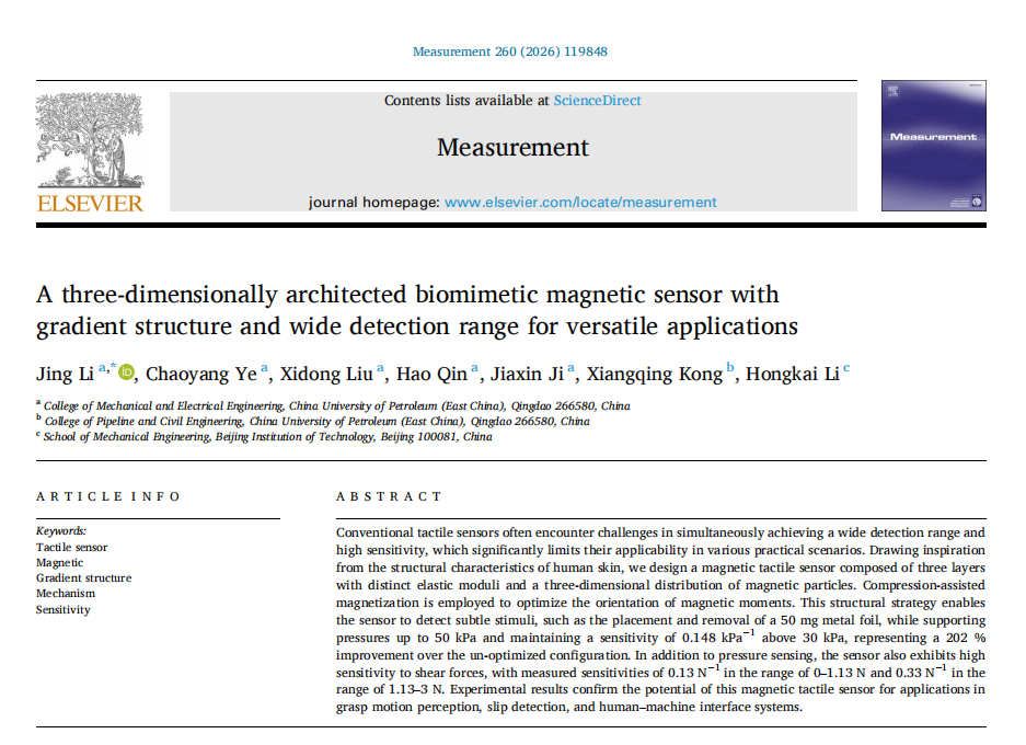 近日,我院机械工程专业硕士研究生叶朝阳在仿生柔性磁传感器研究方面取得进展,相关研究成果《一种可多场景应用具有梯度结构和宽检测范围的三维仿生磁传感器》(A three-dimensionally architected biomimetic magnetic sensor with gradient structure and wide detection range for versatile applications)发表在国际权威期刊《Measurement》上。《Measurement》是测量科学与仪器技术领域的国际知名期刊(SCI二区),目前影响因子5.6,在测量技术与理论、传感器设计领域有重要学术影响力。论文第一作者及通讯作者为李静教授,开云电竞投注(华东)为第一署名单位和唯一通讯单位。该研究得到国家自然科学基金、青岛市自然科学基金的联合资助。