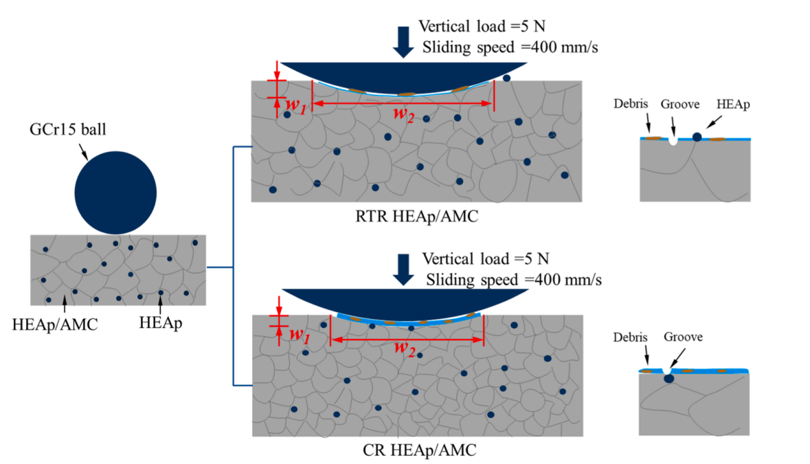 针对这一难题,作者制备了不同质量分数的 HEAp/AMC,并系统研究了室温轧制(RTR)与深冷轧制(CR)工艺对材料摩擦学性能的影响规律。研究发现,经深冷轧制处理后,复合材料在室温下的磨损率从 3.87×10⁻³ mm³/(Nm) 降至 2.70×10⁻³ mm³/(Nm);在低温环境中,磨损率进一步降至 1.41×10⁻³ mm³/(Nm),磨损机制实现从粘着磨损向磨粒磨损的良性转变。