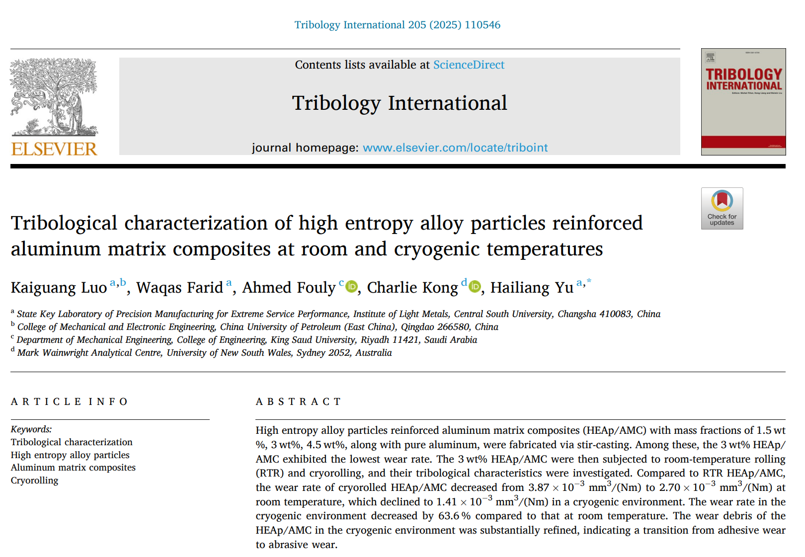 近日,我院青年教师罗开广在高熵合金颗粒增强铝基复合材料(HEAp/AMC)摩擦学性能研究领域取得相关进展,相关研究成果《高熵合金颗粒增强铝基复合材料在室温和超低温环境下的摩擦学表征》(Tribological characterization of high entropy alloy particles reinforced aluminum matrix composites at room and cryogenic temperatures)发表于国际顶级期刊《Tribology International》(IF=6.9,SCI 一区 TOP)。随着航空航天、轨道交通、新能源汽车等高端装备向极端环境服役需求升级,对关键结构材料的比强度、耐磨性及低温适应性提出了严苛要求。高熵合金颗粒增强铝基复合材料凭借优异的综合性能成为该领域重点研究方向,但传统制备工艺存在界面结合薄弱、低温摩擦学性能不佳等技术瓶颈,限制了其在极端工况下的应用。