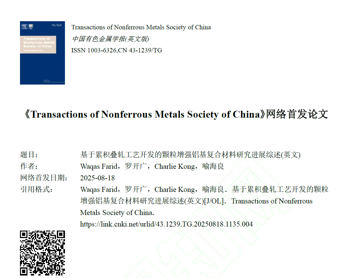 此外,在颗粒增强铝基复合材料制备技术研究方面取得相关进展。相关研究成果《基于累积叠轧工艺开发的颗粒增强铝基复合材料研究进展综述》(Advancements in accumulative roll bonding based process for developing aluminum matrix composites reinforced with particles: A review)发表于Transactions of Nonferrous Metals Society of China。随着航空航天、汽车、国防等行业对高性能轻量化材料的需求日益迫切,颗粒增强铝基复合材料凭借优异的力学性能、抗腐蚀性能和重量优势,成为解决关键部件性能升级的核心材料之一。传统制备方法普遍存在颗粒分散不均、界面结合薄弱、力学性能等问题,制约了其工业化应用。