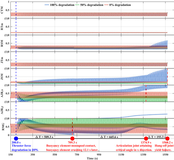 研究结果显示,在完全失去推进能力(100%推进器失效)的工况下,耦合系统将沿着高度危险的灾变路径演化:平台持续漂移,浮力块与月池发生接触并被挤毁,铰接接头转动至极限角度,最终导致悬挂单根屈服失效。在推进器性能下降50%的情况下,隔水管及新型悬挂系统仍保持结构安全,验证了维持部分推进能力对悬挂工况安全的重要性。此外,当平台维持推进能力但发生海床隆起时,LMRP触底后会诱发隔水管上部发生局部屈曲,进一步强调了避免LMRP接触的重要性。综上,提出的动态灾变建模方法为深水隔水管系统灾变演化的定量分析提供了新的理论基础和技术手段。