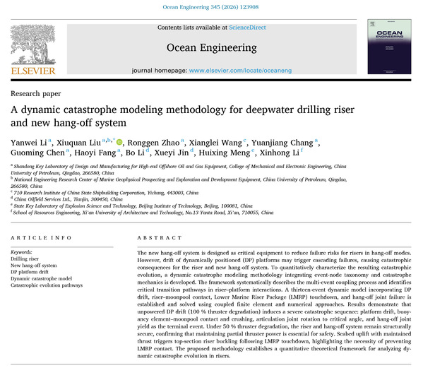 近日,我院安全科学与工程学科博士研究生李彦伟在隔水管-新型悬挂系统动力灾变模型研究方面取得重要进展,相关研究成果《隔水管-新型悬挂系统动力灾变建模方法》(A dynamic catastrophe modeling methodology for deepwater drilling riser and new hang-off system)发表在《Ocean Engineering》。《Ocean Engineering》是海洋工程领域的国际顶级期刊,目前影响因子为5.5(SCI二区TOP)。论文第一作者为博士研究生李彦伟,开云电竞投注(华东)为第一署名单位和唯一通讯单位,该研究得到国家自然科学基金、国家重点研发计划及“泰山学者”青年专家计划等项目的联合资助。