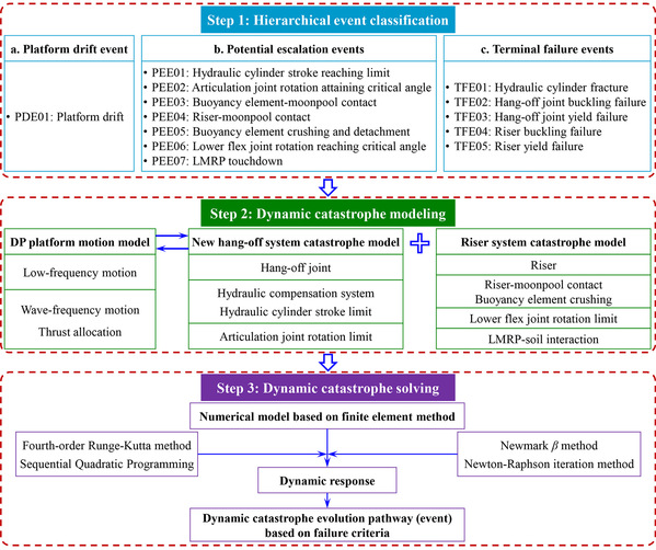 新型悬挂系统作为深水钻井隔水管的重要安全装备,其设计目标在于降低隔水管在悬挂工况下的失效风险。然而,在实际海上作业中,动态定位(DP)平台一旦发生漂移,极易引发一系列连锁性失效事件,最终造成隔水管及新型悬挂系统的灾难性破坏。为此,本研究构建了一种动力灾变建模方法,将事件节点分类法与灾变力学相结合,用于定量描述平台-隔水管-新型悬挂系统耦合作用下的灾变演化过程,并识别系统中可能出现的关键转变路径。基于典型悬挂工况,建立了包含13个事件的动态灾变模型,涵盖DP平台漂移、隔水管与月池接触、LMRP触底及悬挂单根失效等关键过程,并采用有限元与数值分析的耦合计算方法进行求解。