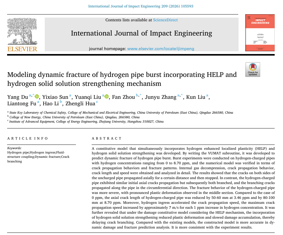 近日,我院安全科学与工程专业硕士研究生孙翼骁在临氢管道爆炸动态断裂方面取得进展,相关研究成果《计及HELP和氢固溶强化作用的临氢管道爆炸动态断裂建模》(Modeling dynamic fracture of hydrogen pipe burst incorporating HELP and hydrogen solid solution strengthening mechanism),发表在《International Journal of Impact Engineering》。《International Journal of Impact Engineering》是爆炸冲击动力学领域的国际权威期刊,目前影响因子为5.7(SCI二区)。论文第一作者和通讯作者为杜洋教授,论文第二作者为2024级硕士研究生孙翼骁,开云电竞投注(华东)为第一署名单位和唯一通讯单位,该研究得到国家重点研发计划课题、国家自然科学基金、山东省自然科学基金、山东省泰山学者项目、山东省青年科技人才托举工程和青岛市自然科学基金的联合资助。
