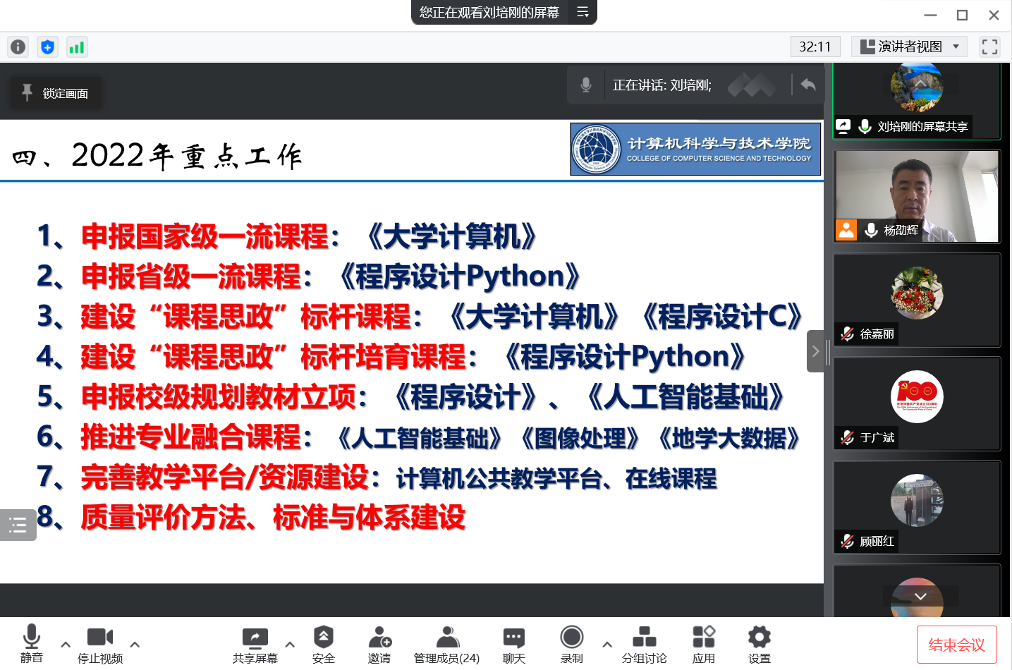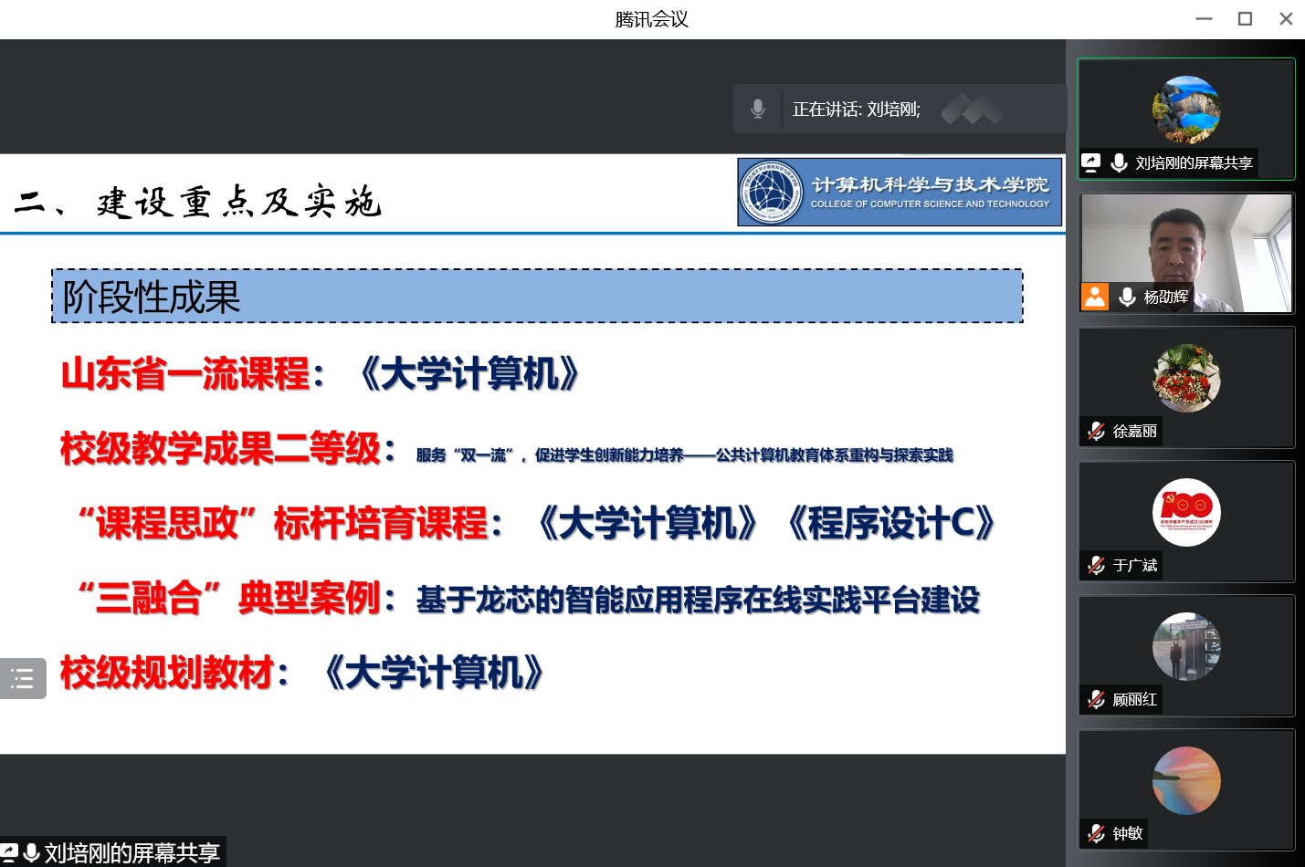 随后,大学计算机课程建设负责人刘培刚从计划建设目标及达成情况、课程建设内容及取得的阶段性成果、课程建设任务及完成情况、2022年工作计划及工作重点四个方面作了汇报。在听取了汇报后,学院副院长李华昱肯定了应用技术系在课程建设上取得的成就,指出应用技术系在教学、教材、资源建设、竞赛等方面做了扎实工作,认为总结汇报非常全面到位,同时也指出,下一步应当注意总结,凝练成果,提早谋划,加强同专业系联系,并对今年一流课程建设、课程思政、申报教改项目、教材立项等重点工作提出了建议。