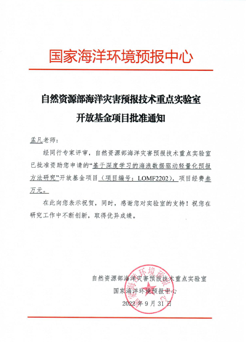 1:自然资源部海洋灾害预报技术重点实验室开放基金课题项目批准通知