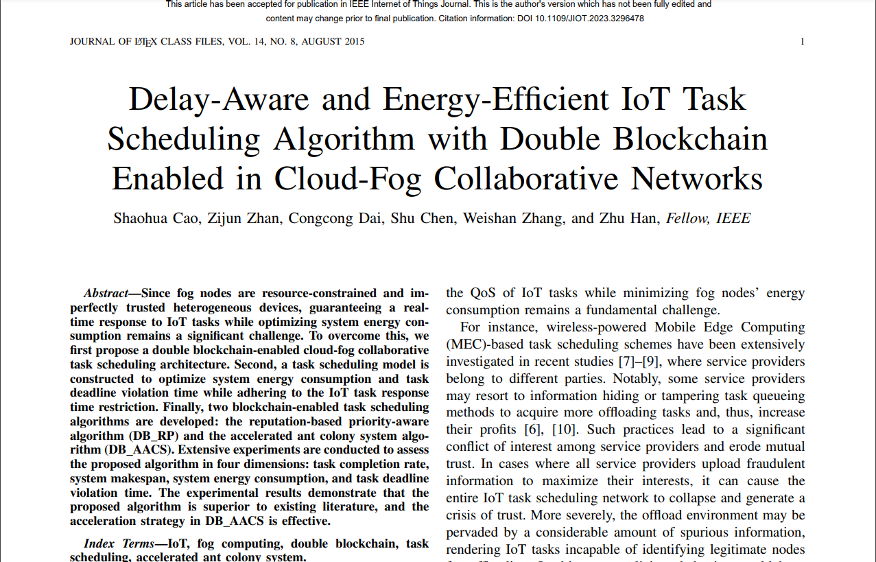 我院教师曹绍华、硕士生詹子俊在在中科院大类分区1区TOP期刊《IEEE Internet of Things Journal》发表题为“Delay-Aware and Energy-Efficient IoT Task Scheduling Algorithm with Double Blockchain Enabled in Cloud-Fog Collaborative Networks”的研究论文。《IEEE Internet of Things Journal》2023年影响因子为9.94,近五年平均影响因子为 11.1,为开云电竞投注(华东)T1期刊。