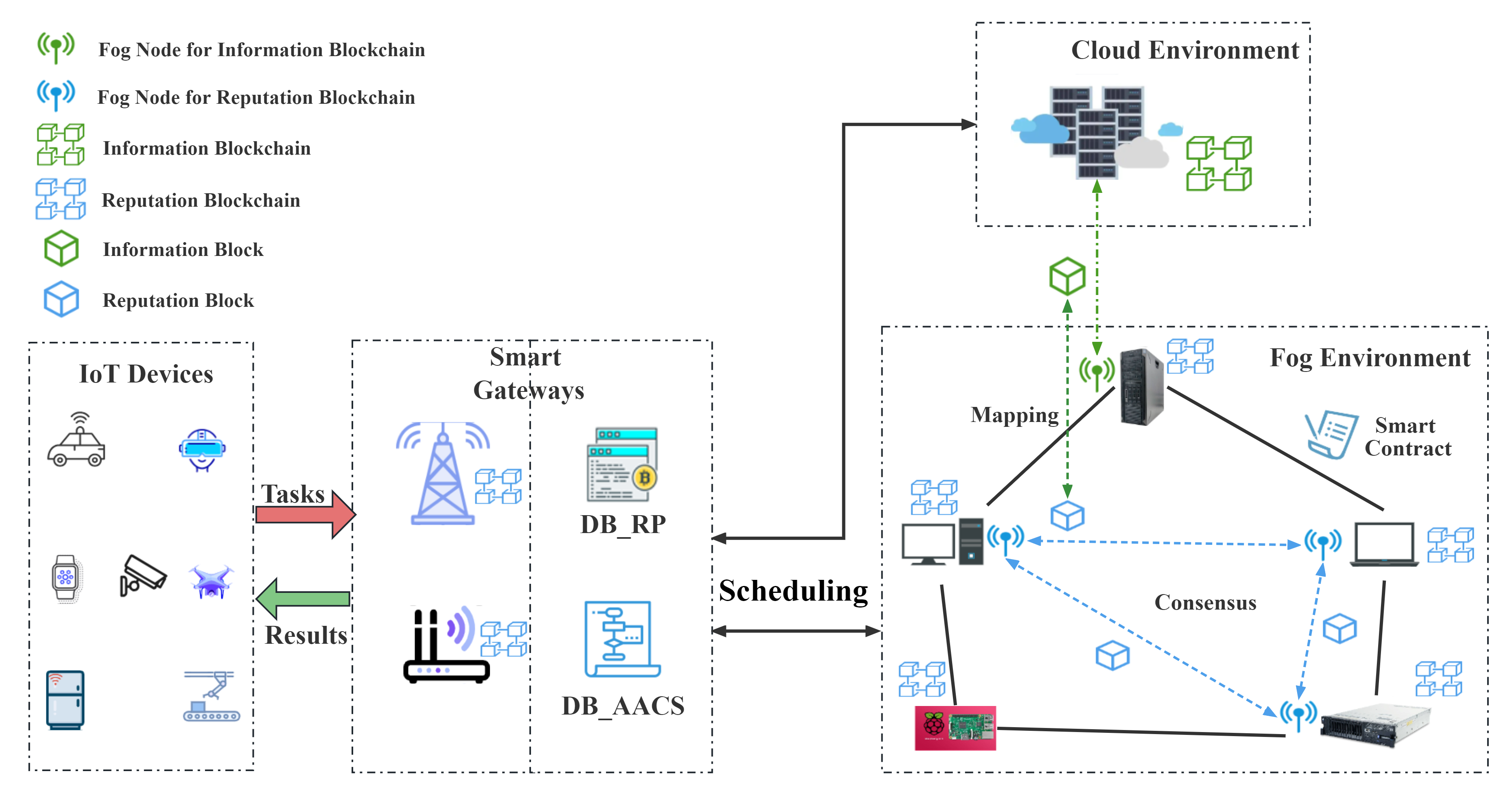 由于雾节点是资源受限且不可完全信任的异构设备,因此在优化系统能耗的同时保证对物联网任务的实时响应仍然是一项重大挑战。为了克服这一难题,我们首先提出了一种支持双区块链的云雾协同任务调度架构。其次,我们构建了一个任务调度模型,在遵守物联网任务响应时间限制的同时,优化系统能耗和任务截止时间违规时间。最后,开发了两种支持区块链的任务调度算法:基于信誉的优先级感知算法(DB_RP)和加速蚁群系统算法(DB_AACS)。我们提出的方法,在任务完成率、系统时间跨度、系统能耗和任务违反截止时间四个维度都取得了很好的结果。