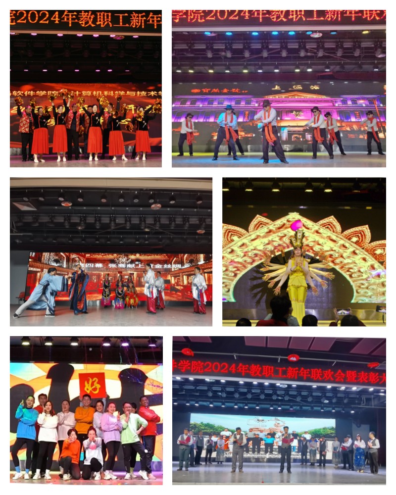 学院各单位为大家带来了精心准备的节目。实验中心带来了欢快的舞蹈《2024欢乐笑开颜》;计算机科学系通过情景剧和舞蹈结合,呈现了独具历史韵味的《张骞出使西域》;应用技术系的舞蹈《千手观音》,老师们配合默契,动作优美、整齐划一,充分展现出老师们的团队合作精神;软件工程系通过激情四溢的诗朗诵和三首改编歌曲相结合的方式为大家带来了别具特色的《相信我》,从教学、科研、青春三个篇章展现了软件系全体教职工敢于担当、奋勇争先的精神面貌;院机关带来的舞蹈《机关阵线联盟》充满了动感与活力,展现了机关服务学院发展、追求卓越、昂扬进取的精神风貌。