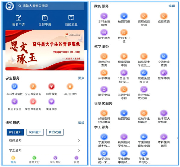 打造“智慧学工”平台体系,以“学生‘一站式’服务门户”和“学工队伍一体化工作平台”为依托,平台通过规范化的工作模块,为每名学生建立了涵盖学业发展、价值观养成等关键维度的动态成长档案,推动了思政教育从“大水漫灌”向“精准滴灌”的转变,显著提升思政教育内容与学生需求的匹配度。