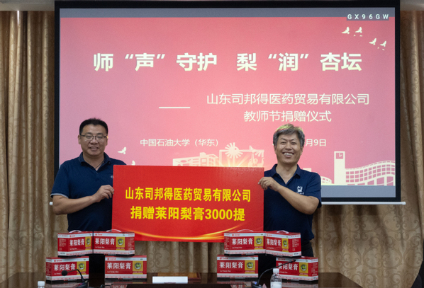 在第41个教师节来临之际,为弘扬尊师重教优良传统,切实关爱教师身心健康,9月9日下午,“师‘声’守护 梨‘润’杏坛”山东司邦得教师节捐赠仪式在文理楼290举行。仪式由理学院党委书记杨辉主持,校工会主席郭文,合作发展处副处长、服务山东办公室副主任马梦华、院工会,以及山东司邦得医药贸易有限公司董事长助理、人资总监刘鹏,OTC事业部总经理、市场总监咸隆等嘉宾出席。