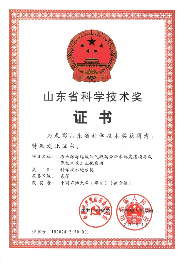Jun 27th, The Shandong Science and Technology Conference was held in Jinan to commend the winners of the 2024 Shandong Science and Technology Award. Two projects from School of Geosciences received the awards. The project Formation of Nanopores and the Mechanism of Oil and Gas Accumulation in Shale, led by Professor Wang Min, won the second prize in natural science. The other project Modeling and Industrial Application of High Resolution Seismic and Imaging Technology for subtle reservoir in Deep water and deep Reservoirs, led by Professor Qu Yingming, won the second prize in Science and Technology Progress Award.