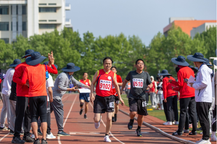 孙小龙、严一鸣在比赛3000米,这个项目教工项目距离最长,孙小龙第四,严一鸣第7,冲刺晚了一点,很有实力,本来是可以取上名次的。两位还是去年篮球夺冠的功臣,谢谢两位!