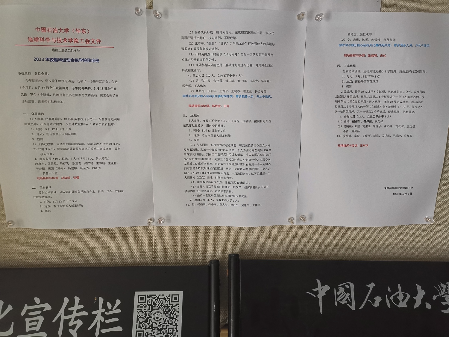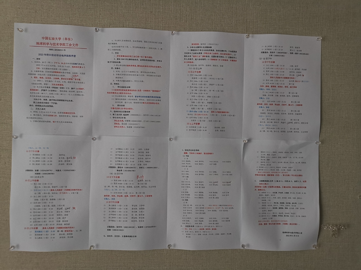 今年运动会,学校组织人员换了,秩序册下发很晚。学院有以前基础,提前搞好院秩序册初稿,5月8日学校电子版出来后,及时修改基本成型,出台两个文件,加上全体工会干部及时协商和调整,保障了两个运动会有序进行。此前还开了运动会筹备会,落实了报名、仪仗队换装、太极拳人员等相关事项。