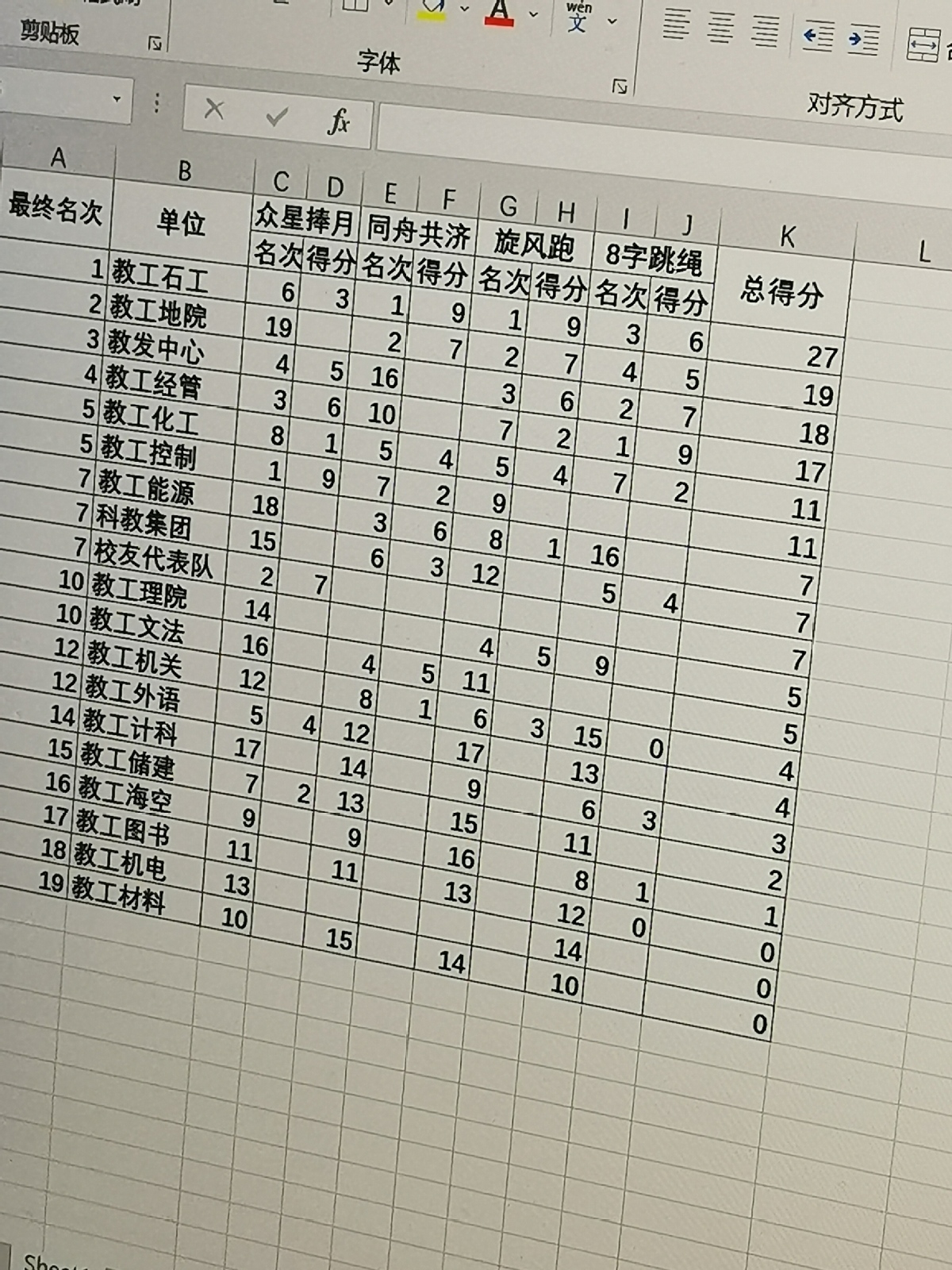 两天的教职工田径运动会和趣味运动会圆满闭幕了,尽管我们面临男甲核心队员退休、升组人员很少、不少老师科研出差、博士面试时间冲突、两个运动会时间叠加等较多困难,经过全体运动员顽强拼搏,我们仍以很大的优势战胜化院、石工等职工人数比我们多的单位,保持教学院部第一!趣味运动会也取得全校第二的优秀成绩!今年成绩不容易,在这里学院工会要感谢全体运动员,感谢院工会全体服务人员,感谢院系领导,感谢具有优良文体传统的全体地院人!