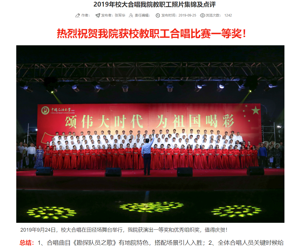 本次比赛的成功,很大一个原因是我们选了很好的歌曲——《祖国不会忘记》,学校主页报道很到位:“我把青春融进,融进祖国的江河”,地球科学与技术学院带来的《祖国不会忘记》体现了在学校“双一流”建设征程中,学院师生攻坚克难、奋发向上的昂扬斗志,引发全场观众的共鸣。”