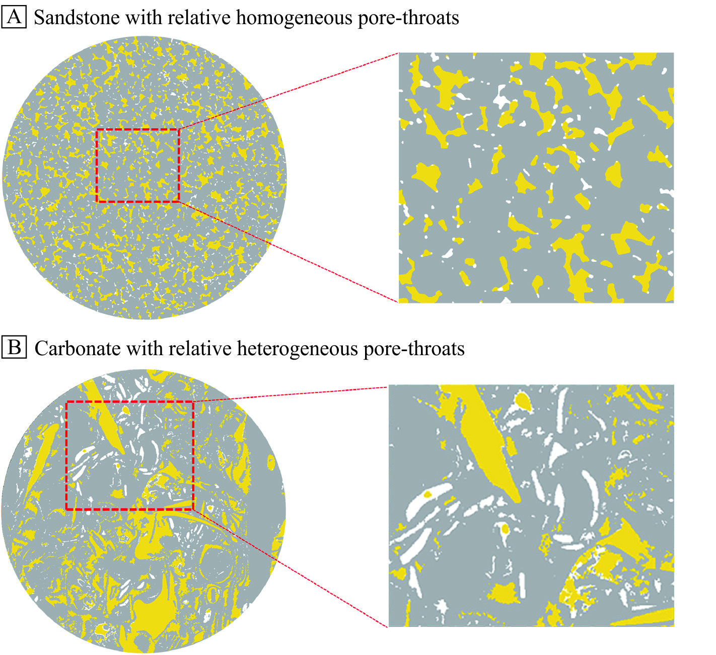 图2. 储层孔隙结构非均质性对盐析作用的影响:(A)相对均质孔喉的砂岩、(B)相对非均质孔喉的碳酸盐岩(Akindipe et al. 2021)